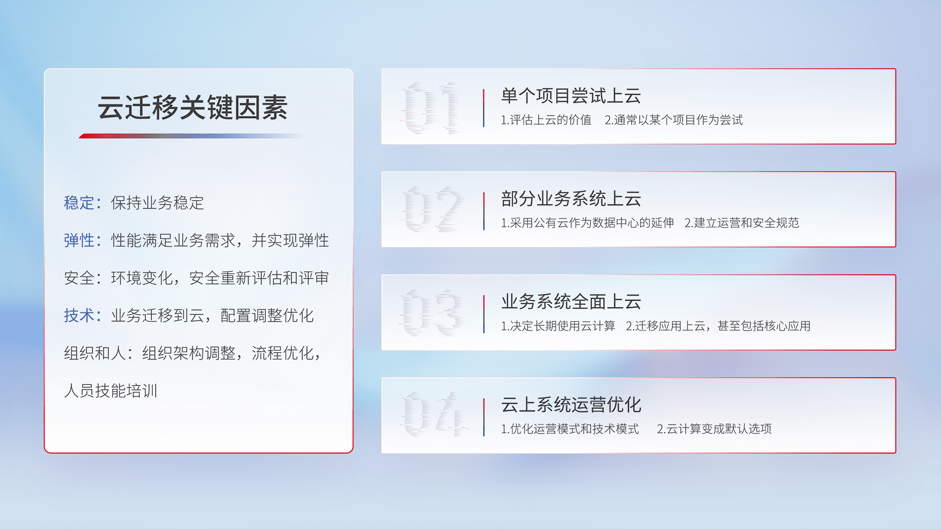 结合实际业务,,从规划设计、、、、云平台选型、、、、云原生改造、、数据迁移、、、、集成交付,,,迁移全过程为客户识别最佳上云路径,,,,做好风险识别管理,,设计网络架构、、身份权限、、、、安全审计合规、、、操作审计、、、、日志审计、、、监控告警策略、、多站点容灾设计等,,,,对云上基础设施进行整体规划,,提升IT治理水平,,,,以满足弹性、、、高可用、、高性能的需求。。。